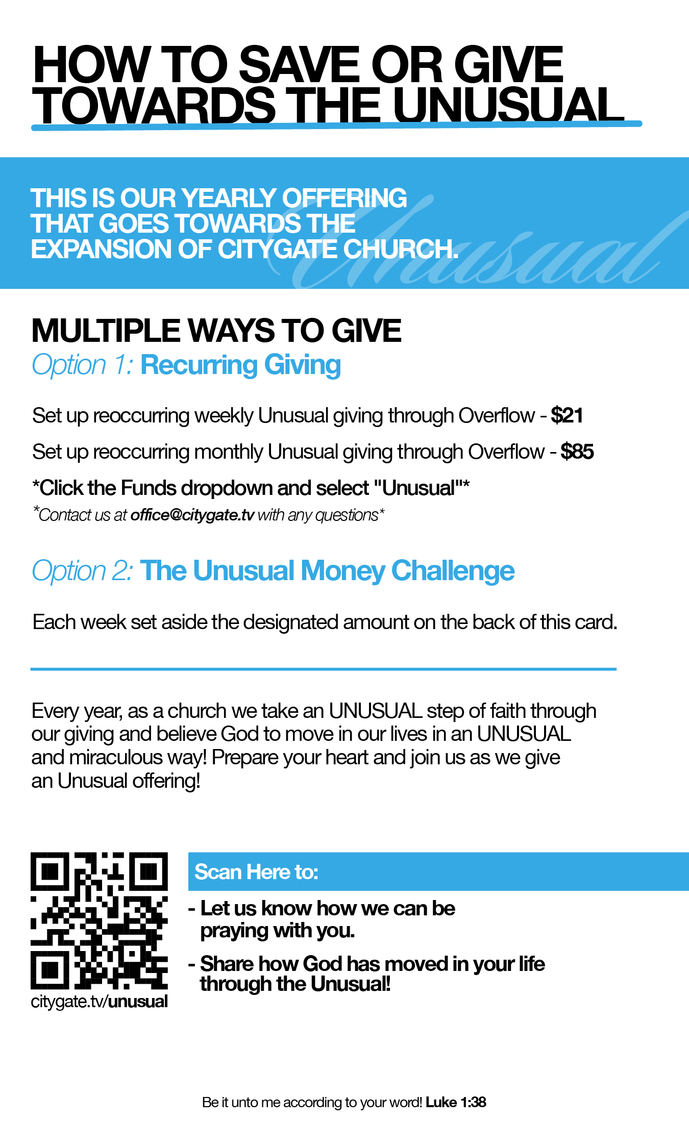 Every year, we set aside a season to believe for what only God can do. It’s a time to take an unusual step of faith and expect the miraculous. This is that season a time to push past the ordinary, to dream again, to believe again, and to see the unusual happen in your life. For the past fifteen years, The Unusual has marked our church-and we believe God’s not finished yet. Starting Sunday, November 1, 2026, we spend three weeks building our faith and preparing for Unusual Sunday on November 16, 2026. Every year, we’ve seen God move in miraculous ways, and we know this year will be no different. Begin praying and writing down the areas in your life where you’re believing for an unusual miracle, and get ready to take an unusual step of faith.